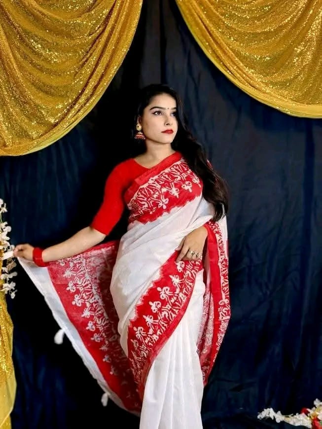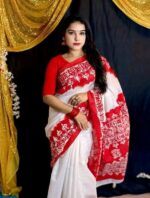 হাফসিল্ক স্কিন প্রিন্ট শাড়ী, ১২ হাত লম্বা। আরামদায়ক কাপড়, ব্লাউজ পিস নেই। স্কিন প্রিন্টের কাজ শাড়িটিকে দেয় এক্সক্লুসিভ লুক।